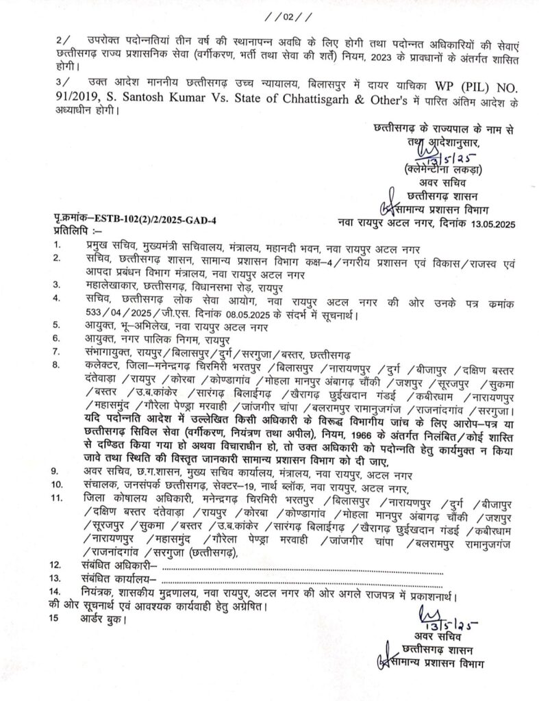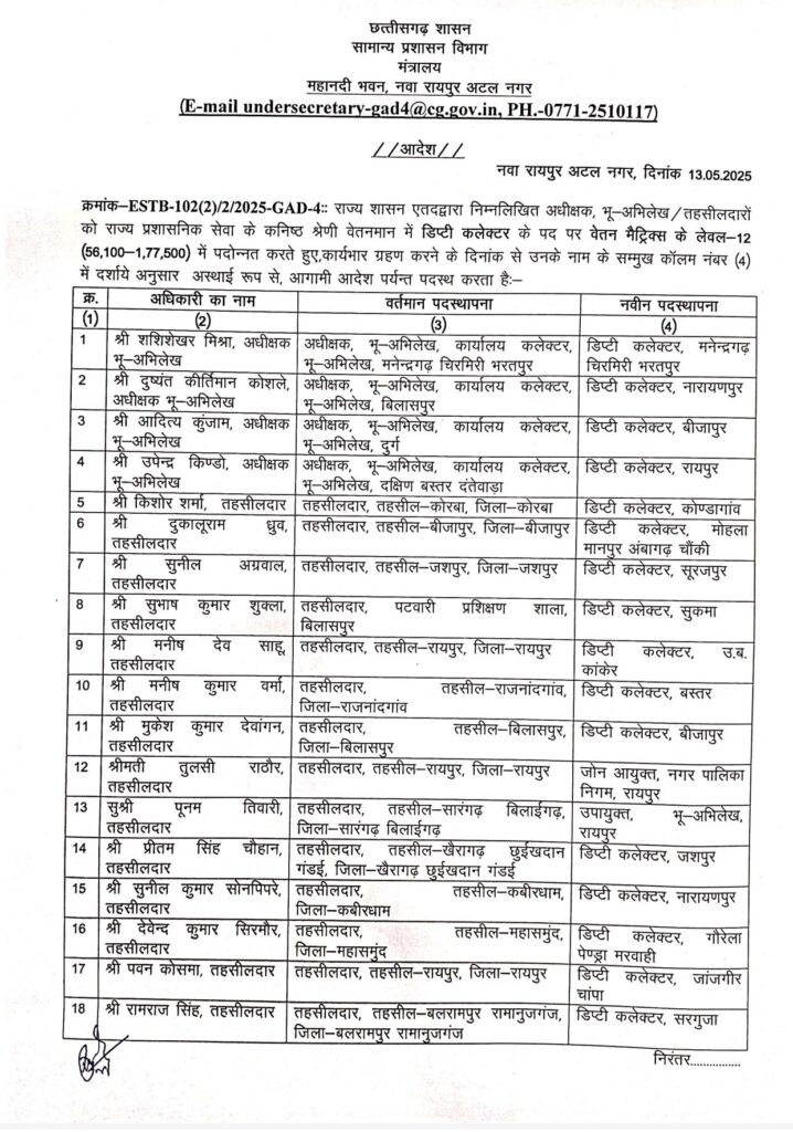 रायपुर/छत्तीसगढ़ शासन के सामान्य प्रशासन विभाग ने प्रशासनिक सेवा में बड़ा फेरबदल करते हुए प्रदेश के 18 तहसीलदारों को राज्य प्रशासनिक सेवा में पदोन्नत कर डिप्टी कलेक्टर के पद पर पदोन्नति किया गया है। जिसमे बिलासपुर के तहसीलदार मुकेश कुमार देवांगन का भी नाम शामिल है।