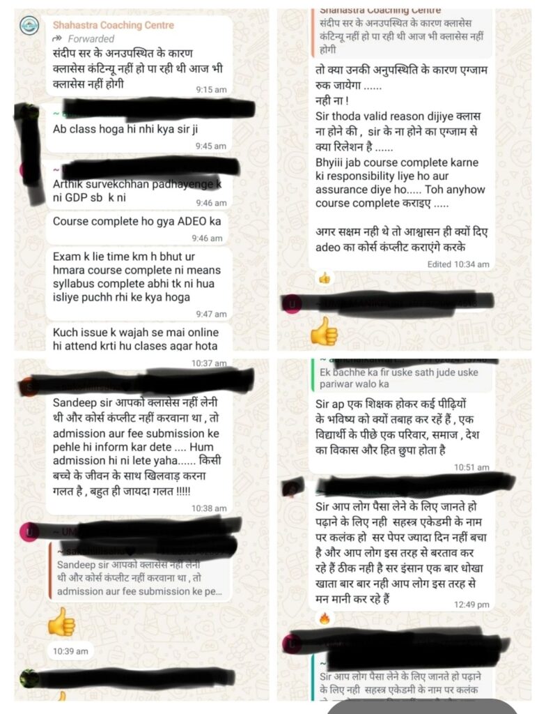 *5 छात्र/छात्रा: सर आपलोग सिर्फ पैसा लेने जानते हो “सहस्त्र अकादमी के नाम पे कलंक हो सर” आप लोग