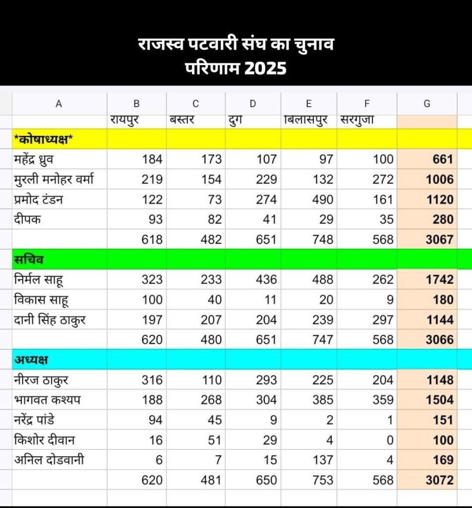 राजस्व विभग में प्रदेश पटवारी संघ का चुनाव आज दिनांक 29/06/2025 को सम्पन्न हुआ। अलग अलग संभाग में चुनाव का मतदान हुआ जिसमें बिलासपुर संभाग के लिए त्रिवेणी भवन में मतदान सुबह 10 बजे से 4 बजे शाम हुआ।