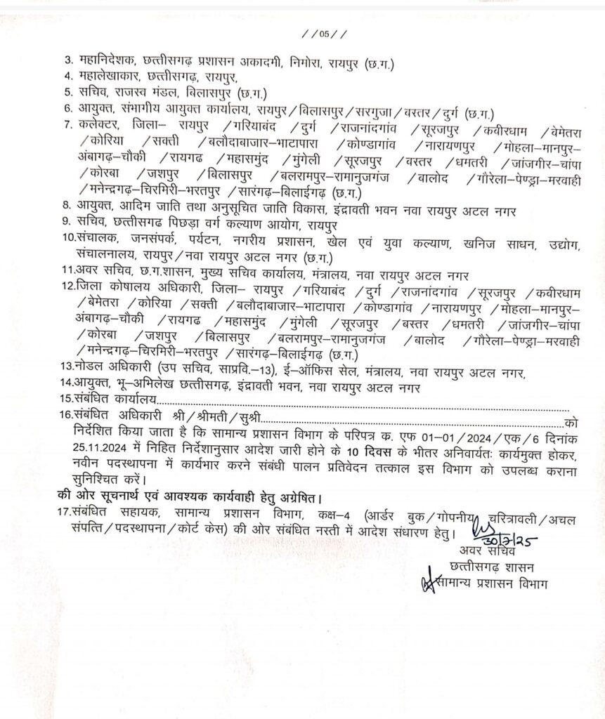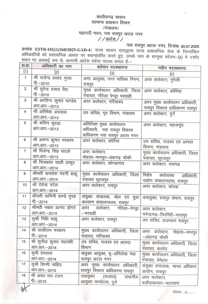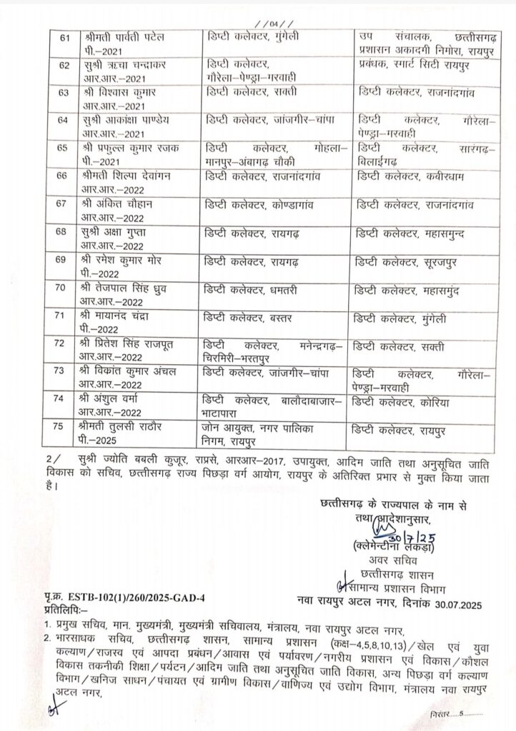 छत्तीसगढ़ शासन ने प्रदेश में तबादला सूची जारी किया है। जिसमे राज्य प्रशासनिक सेवा के अधिकारियों डिप्टी कलेक्टर/अपर कलेक्टर एवं सयुंक्त कलेक्टर की त75 अधिकारियों का तबादला किया गया।