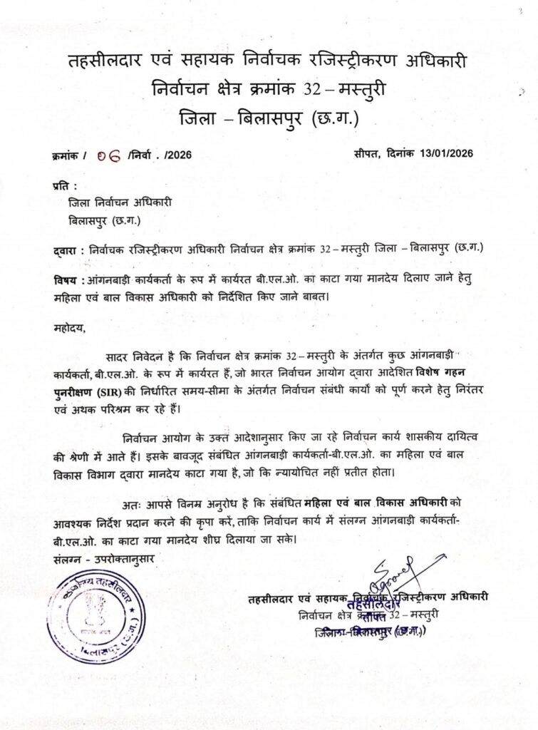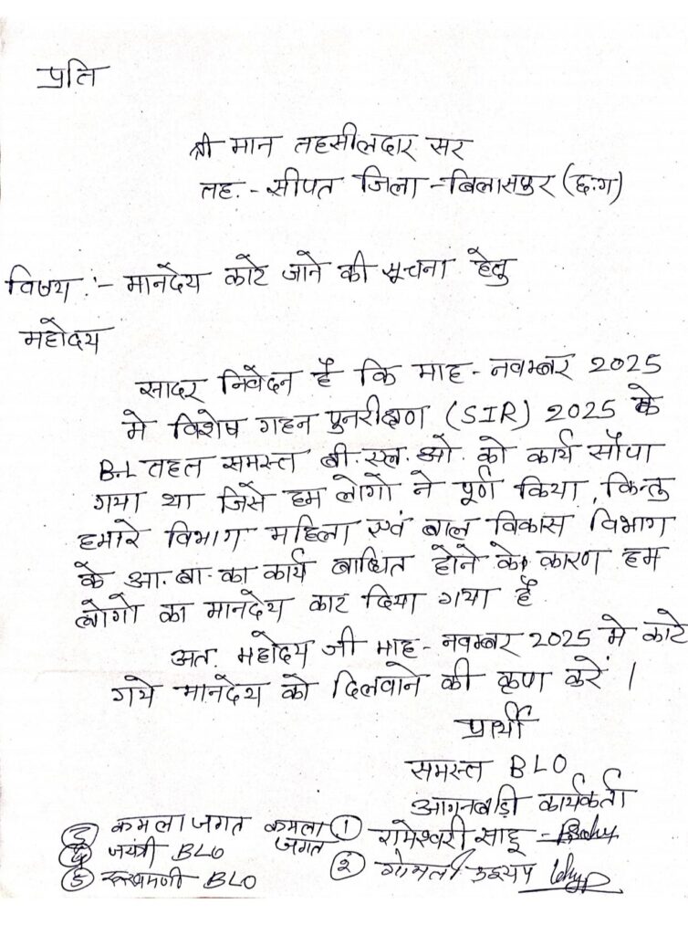 विशेष गहन पुनरीक्षण (SIR) 2025 के तहत निर्वाचन कार्य में लगाए गए आंगनबाड़ी कार्यकर्ता-बीएलओ का नवंबर 2025 का मानदेय काटे जाने का मामला सामने आया है। इस संबंध में समस्त बीएलओ आंगनबाड़ी कार्यकर्ताओं ने तहसीलदार सीपत को लिखित आवेदन देकर कटा हुआ मानदेय दिलाने की मांग की है।