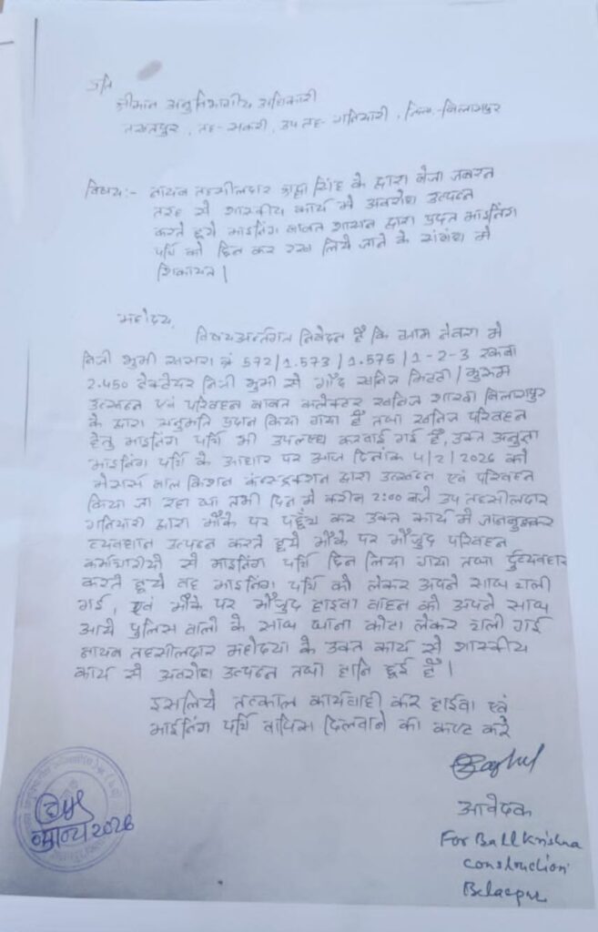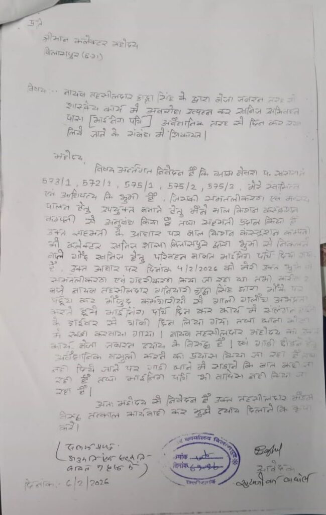 बिलासपुर जिले के गनियारी तहसील क्षेत्र में पदस्थ नायब तहसीलदार की कार्यप्रणाली एक बार फिर विवादों के घेरे में आ गई है। एक किसान और खनन कार्य से जुड़े लोगों ने नायब तहसीलदार श्रद्धा सिंह पर पद के दुरुपयोग, मनमानी कार्रवाई और कथित रूप से रिश्वत मांगने जैसे गंभीर आरोप लगाए हैं।